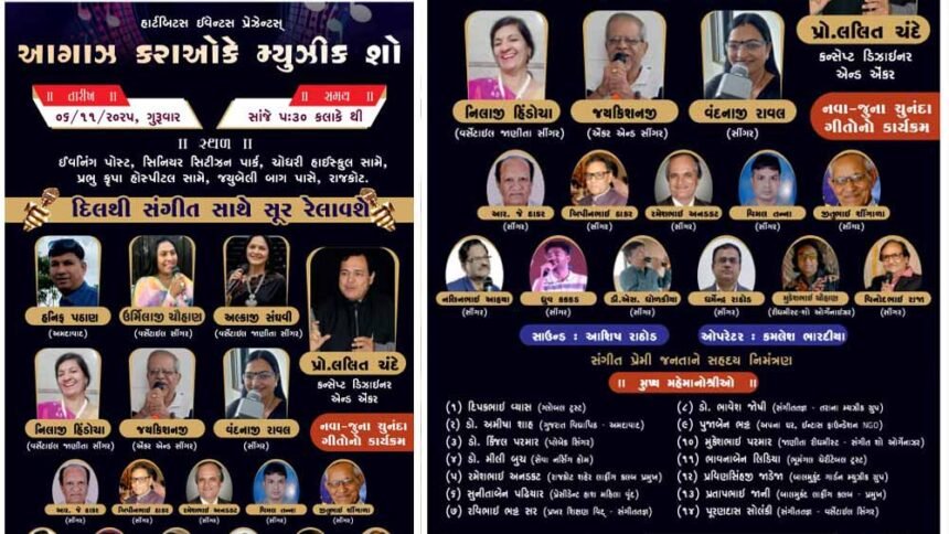 હાર્ટબિટ્સ ઇવેન્ટ્સ દ્વારા આગામ કરાઓકે મ્યુઝિક શોનું ભવ્ય આયોજન કરવામાં આવ્યું છે. આ સંગીત મય કાર્યક્રમ 6 નવેમ્બર ગુરુવારના રોજ સાંજે 5.30 વાગ્યે રાજકોટના ઈવનીંગ પોસ્ટ, ચૌધરી હાઈસ્કૂલ સામે યોજાશે. આ કાર્યક્રમમાં પ્રખ્યાત સંગીતકારો, ગાયકો અને સંગીત પ્રેમીઓની હાજરી રહેશે. કાર્યક્રમમાં દિલથી સંગીત સાથે સૂર રેલાશે અને શ્રોતાઓને નવી-જૂની સુમધુર ગીતોની મોજ માણવાનો અવસર મળશે. કાર્યક્રમનું માર્ગદર્શન અને સંચાલન પ્રો. લલિત ચંદે સંભાળશે.