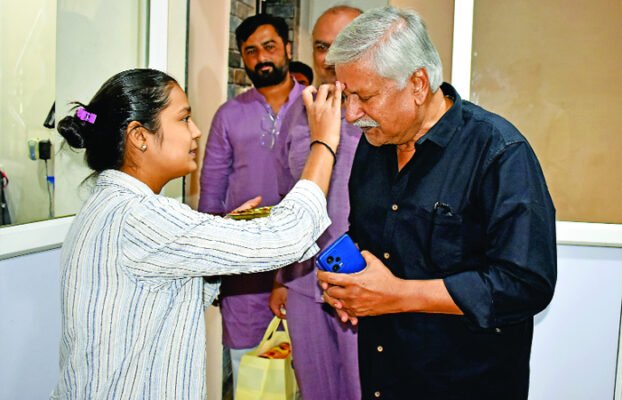 ‘ખાસ-ખબર’માં પધારેલા ‘અકિલા’ના મોભી તથા અમારા પણ મોભી-આજીવન માર્ગદર્શક એવા કિરીટકાકાનું કુમકુમ તિલક કરીને અમારા પરિવારની દીકરી ધર્મિષ્ઠા ગોસ્વામીએ સ્વાગત કર્યું હતું