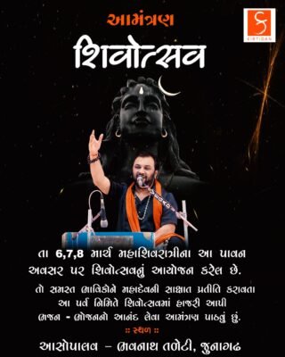 જૂનાગઢ ના ભવનાથ તળેટી માં મહાશિવરાત્રી ના મહાપર્વ અંતર્ગત પરંપરાગત મેળા માં લાખો ભાવિકો આવે છે ત્યારે જાણીતા લોકગાયક કીર્તિદાન ગઢવી દ્વારા ભવનાથ તળેટી માંજ મહાશિવરાત્રીના આ પાવનકારી પર્વ માંઆસોપાલવના ગ્રાઉન્ડ માં તારીખ 6/7/8માર્ચ એમ ત્રણ દિવસ ના શિવોત્સવ નું આયોજન કરવામાં આવ્યું છે મેળા માં આવતા ભાવિકો માટે ભજન ભોજન અને ભક્તિ ના ત્રિવેણી સંગમ રૂપ આ શિવોત્સવ માં ભાવિકો ભોજનસેવા અને રાત્રે સંતવાણી માં નામાંકિત કલાકારો ભજન અને લોકસાહિત્ય ની જમાવટ અહીં થશે. જૂનાગઢ ની આ તીર્થનગરી માં મહાશિવરાત્રી પર્વે ભવનાથ ના સાનિધ્ય ઉતારા અને સેવા કેમ્પ નો ધમધમાટ હશે ત્યારે આસોપાલવ ના આ ત્રીદીવસીય શિવોત્સવ માં સાધુ સંતો મહંત કથાકાર સહીત પધારશે તો મેળા માં આવનારા તમામ ભાવિકો ને ભજન ભોજન નો લાભ લેવા કીર્તિદાન ગઢવી પરીવાર એ નિમંત્રણ પાઠવ્યું છે.
