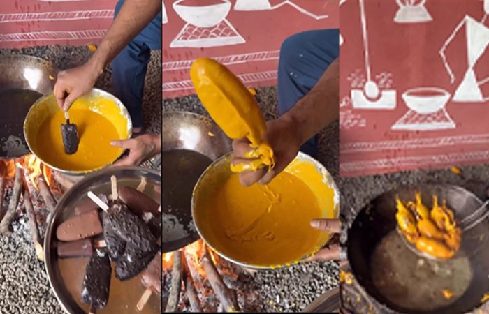 આ વાયરલ વીડિયોમાં એક વ્યક્તિ ભજીયા બનાવી રહ્યો છે. પરંતુ આ ભજીયા બટાકા કે મેથીના નથી પણ આઇસક્રીમના છે. આ આઇસક્રીમના ભજીયા તે બીજા સમાન્ય ભજીયાની માફક જ બનાવી રહ્યો છે. જેમાં તે ચોકોબાર આઇસક્રીમને બેસનમાં ડુબાડી પછી ગરમ તેલમાં તળી રહ્યો છે. અહીંયા એક અજીબ વાત એ રહી કે, તળાઈ ગયા બાદ આ ચોકોબાર ઓગળી જવાની જગ્યાએ તે એકદમ ભજીયાની માફક ક્રંચી દેખાઈ રહી હતી.