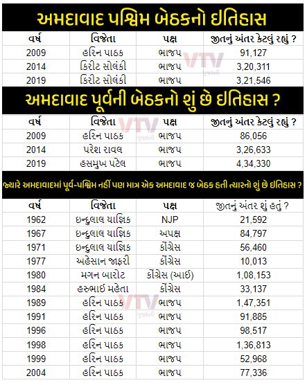 વિગતો મુજબ અમદાવાદ ઇસ્ટમાં વિધાનસભાની 7 જ્યારે અમદાવાદ વેસ્ટની 7 બેઠકો છે. આ વખતે અમદાવાદ ઇસ્ટમાં 20.10 લાખ જ્યારે અમદાવાદ વેસ્ટમાં 17.11 લાખ મતદારો છે. જો આપણે ઇતિહાસ પર નજર ફેરવીએ તો મતદાનમાં અમદાવાદ નીરસ રહ્યું છે. વર્ષ 2009, 2014 અને 2019ની લોકસભા ચૂંટણીમાં 63 ટકાથી પણ ઓછું મતદાન નોંધાયું હતું. અમદાવાદ બેઠક પરથી હરિન પાઠક 1989, 1991, 1996, 1998, 1999, 2004, 2009 એમ સૌથી વધુ સાત વખત સાંસદ તરીકે ચૂંટાયા હતા.