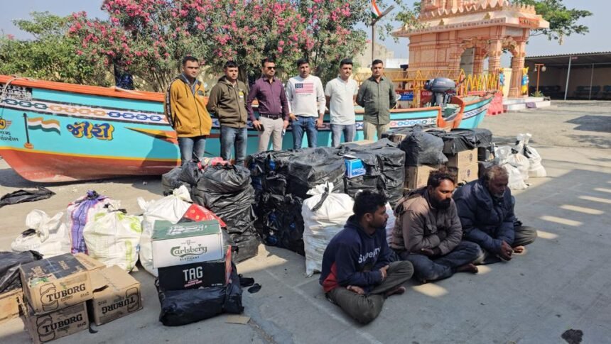 દિવમાંથી બોટમાં ભરી દરિયાઇ માર્ગે જાફરાબાદ ખાતે વિદેશી દારૂ મોટી માત્રામાં લઇ જવાતો હોવાની ક્રાઇમ બ્રાંચના પીએસઆઇ વી.કે.ઝાલા તથા પોલીસ સ્ટાફને મળેલી બાતમી આધારે દરિયામાં પેટ્રોલીંગ હાથ ધરવામાં આવ્યુ હતુ. ત્યારે નવા બંદરના દરિયામાં 3 નોટીકલ માઇલ જીરી નામની બોર્ટ નં.જી.જે.32 એમ.ઓ.7628 જિલ્લા ક્રાઇમ બ્રાંચ ટીમ દરિયામાં બુટલેગર પોલીસ વચ્ચે ફિલ્મી દ્રશ્યો સર્જાયા હતા અને ભારે જહેમત બાદ બોટ અને પોલીસે રોકાવી તેની તલાસી લેતા બોટમાં રાખેલ વિદેશી દારૂની પેટી નંગ128 જેની કિંમત રૂા.4,62,300 તેમજ બીયરની પેટી નંગ.20 અને બોટ સહિત કુલ રૂા.7,61,700નો મુદ્દામાલ ઝડપી પાડી ઇસ્માઇલ અબ્દુલા પટેલીયા રહે.ધામળેજ, ભરત લાખા સોલંકી રહે.નવાબંદર તેમજ મહેશ ઉર્ફે મુન્નો લાખાભાઇ રાઠોડ રહે.ખત્રીવાળાને ઝડપી પડયા હતા અને નવાબંદર પોલીસ સ્ટેશનમાં ગુનો નોંધી ધોરણસરની કાર્યવાહી હાથ ધરી હતી.