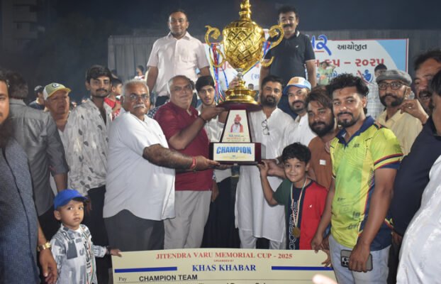 ‘ખાસ-ખબર’ આયોજીત જીતેન્દ્ર વરૂ મેમોરિયલ કપ ક્રિકેટ ટુર્નામેન્ટનો ગઈકાલે છેલ્લો દિવસ હતો. સતત 14 દિવસ સુધી ચાલેલી આ ટૂર્નામેન્ટમાં ખેલાડીઓ, પ્રેક્ષકો અને દરરોજ ઉપસ્થિત રહેલાં મુખ્ય મહેમાનોને જલ્સો પડી ગયો હતો. ‘ખાસ-ખબર’ના આ જાજરમાન આયોજનની રાજકોટનાં ક્રિકેટ રસિયાઓએ ખુબ જ પ્રશંસા કરી હતી. ચુસ્ત સિક્યુરિટી, પાર્કિંગ, ગ્રાઉન્ડ પર એમ્બ્યુલન્સ સહિતની વ્યવસ્થાઓએ તમામ ટીમના ખેલાડીઓ અને ટીમ મેનેજમેન્ટ અને પ્રેક્ષકોનું દીલ જીતી લીધું હતું. 14 દિવસ સુધી ચાલેલા ક્રિકેટના આ મહાકુંભમાં શનિવારે બે સેમિ ફાઈનલ મેચ રમાઈ હતી. જે બાદ રવિવારે સુપર સન્ડે ફાઈનલ મુકાબલો યોજાયો હતો. જેમાં બંને ટીમના ખેલાડીઓએ ફાઈનલ મેચમાં જોરદાર પ્રદર્શન કર્યું હતું. હજ્જારોની સંખ્યામાં ઉપસ્થિત રહેલાં પ્રેક્ષકોથી ખેલાડીઓનો ઉત્સાહ જાણે બેવડાઈ ગયો હતો. ગઈકાલે રવિવારે યોજાયેલી ફાઈનલ મેચમાં DC ઈલેવન જૂનાગઢ અને LK સ્ટાર બંગાળી વચ્ચે ખરાખરીનો ખેલ જામ્યો હતો જેને નિહાળવા હજારોની સંખ્યામાં ક્રિકેટ રસિયાઓ ઉમટી પડ્યા હતા. જેમાં LK સ્ટાર બંગાળીએ શાનદાર બોલિંગ થકી DC ઈલેવન જૂનાગઢ કે જે ફાઈનલમાં વિજેતા થવાની દાવેદાર ટીમ હતી તેને માત્ર 71 રનમાં ઓલઆઉટ કરી દીધી હતી. જે બાદ LK સ્ટાર બંગાળી રાજકોટે 6.4 ઓવરમાં 74 રન ફટકારી ચેમ્પિયન બની હતી અને ‘ખાસ-ખબર’ આયોજીત જીતેન્દ્ર વરૂ મેમોરિયલ કપનો ખિતાબ પોતાના નામે કરી લીધો હતો. જ્યારે DC ઈલેવન જૂનાગઢ ટીમ રનર્સ અપ બની હતી. વિજેતા ટીમ અને રનર્સઅપ ટીમ પર લાખેણા ઈનામોની વણઝાર કરાઈ હતી.