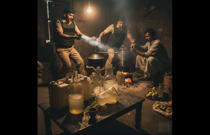 વઢવાણ સ્થાનિક પોલીસ મથકનો સ્ટાફ પેટ્રોલિંગમાં હોય તેવા સમયે ખારવા રોડ પર આવેલા નરેન્દ્ર સિંહ ઉર્ફે મુન્ના દીપસિંહ પરમારની વાડી ખાતે ગેરકાયદેસર દેશી દારૂ બનાવવાની ભઠ્ઠી ધમધમતી હોય જે અંગેની બાદમીને આધારે સ્થાનિક પોલીસની ટીમ દ્વારા દરોડો કરી દેશી દારૂ સાત લિટર કિંમત 1400 રૂપિયા, દેશી દારૂ બનાવવાનો આથો દશ લિટર કિંમત 250 રૂપિયા તથા દેશી દારૂ બનાવવાના સાધનો કિંમત 1500 એમ કુલ મળી 3150 રૂપિયાનો મુદ્દામાલ જપ્ત કરી નરેન્દ્રસિંહ ઉર્ફે મુન્ના દીપસિંહ પરમાર (રહે: રામ દરબાર સોસાયટી, વઢવાણ) વાળાને ઝડપી લઇ ગુનો નોંધી કાયદેસરની કાર્યવાહી હાથ ધરી હતી.