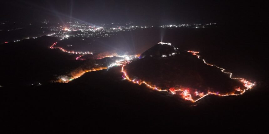 #WATCH | Banaskantha, Gujarat: Night drone visuals of the evening 'Maha Aarti' and 'Gabbar' at Shaktipeeth Ambaji Temple. (15.02) pic.twitter.com/GbJIhvGtqt