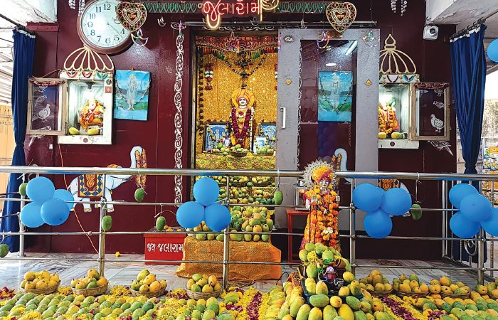 વેરાવળમાં આવેલ જલારામ મંદિરે પૂ.જલારામ બાપાને 351 કીલો કેસર કેરીનો આંબા મનોરથ કરવામાં આવ્યો હતો. આ મનોરથના દર્શન કરી જલારામ ભક્તો ભાવવિભોર બની ગયા હતા. ગુરૂવાર હોવાથી રાત્રીના મોટી સંખ્યામાં ભાવિકોની ઉપસ્થિતિમાં ધૂન-ભજનની રમઝટ બોલાવી મહાઆરતી કરવામાં આવી હતી. દર વર્ષે ભીમ અગિયારસ પર્વે કેસર કેરીઓ મંદિર-હવેલી સહિતના ધાર્મિક સ્થાનોએ ધરવા તથા એકબીજા સંબંધીઓને આપવાનું માહાત્મ્ય લોકોમાં વર્ષોથી છે. ત્યારે દર વર્ષે ભીમ અગિયારસની નજીકના દિવસોમાં વેરાવળમાં મોટી શાકમાર્કેટ પાસે આવેલ જલારામ મંદિરએ પણ અલોકિક આંબા મનોરથનું આયોજન કરાય છે. જે મુજબ આજે સવારે મંદિરે પૂ.જલારામ બાપાના ચરણોમાં વિશ્વમાં પ્રખ્યાત એવી ગીરની 351 કીલો કેસર કેરી ધરી આંબા મનોરથ કરવામાં આવેલ હતો. ત્યારબાદ મનોરથમાં ધરાયેલ 351 કીલો જેટલી કેરીઓ બાપાના ચરણો અને પરીસરમાં સુવ્યવસ્થિત રીતે સજાવટ સાથે ગોઠવીને પાંચેક કલાકની મહેનત બાદ અલોકિક શણગાર કરવામાં આવેલ હતો. બાદમાં સાંજે ચાર થી રાત્રીના દસ વાગ્યા સુધી આંબા મનોરથ શણગારના દર્શન ભક્તો માટે ખુલ્લા મુકવામાં આવેલ હતા. આ અલોકિક શણગારના દર્શન કરી જલાબાપાના ભકતો ઘન્યતા પ્રાપ્ત કરી ભાવવિભોર બન્યા હતા.