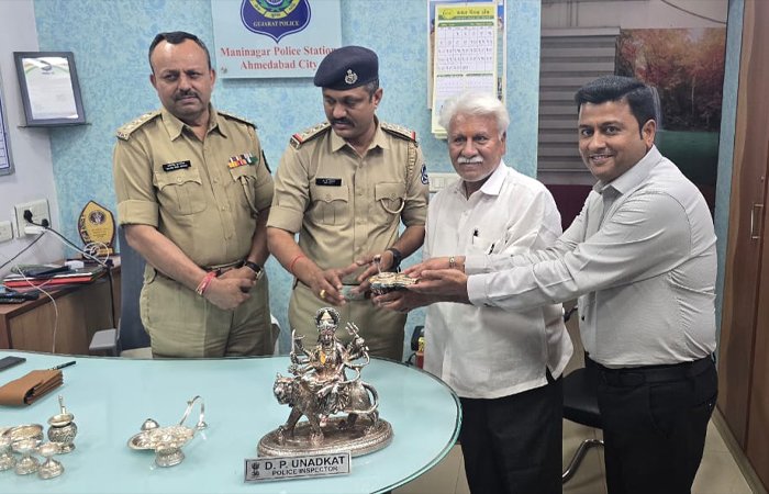 જ્યારે તેરા તુજકો અર્પણ કાર્યક્રમ અંતર્ગત જે ડિવિઝન ના એસીપી પ્રદીપસિંહ જાડેજાના માર્ગદર્શન હેઠળ મણિનગર પોલીસ સ્ટેશનના પીઆઇ ડી.પી.ઉનડકટ, પીએસઆઈ વી.એમ.પરમાર તથા સ્ટાફ દ્વારા ફરિયાદીને સામેથી બોલાવી, નામદાર કોર્ટમાં અરજી કરાવી, તમામ કાર્યવાહીમાં મદદરૂપ થઈ, તાત્કાલિક મુદ્દામાલ પરત સોંપવા અભિપ્રાય સહિતની કાર્યવાહી કરવામાં આવતા, ચોરી થયાને 08 દિવસની અંદર ઘરફોડ ચોરીમાં ગયેલ માતબર રકમનો મુદ્દામાલ કિંમત રૂ. 5,65,000/- નો ફરિયાદીને મણિનગર પોલીસ સ્ટેશન ખાતે રૂબરૂ બોલાવી, ડીસીપી ઝોન 06 શ્રી રવિ મોહન સૈની, ના માર્ગદર્શન હેઠળ જે ડિવિઝન ના એસીપી પ્રદીપસિંહ જાડેજા તથા મણિનગર પોલીસ સ્ટેશનના પીઆઇ ડી.પી.ઉનડકટ, સહિતના તમામ પોલીસ અધિકારીઓની હાજરીમાં સોંપવામાં આવી હતી.અમદાવાદ શહેર પોલીસ દ્વારા તેરા તુજકો અર્પણ કાર્યક્રમના ભાગરૂપે માત્ર 08 દિવસમાં ફરિયાદીને માતબર રકમના સોના ચાંદીના દાગીના, માતાજીની મૂર્તિ, પૂજાના સામાન સહિત પરત કરવામાં આવતા, ફરિયાદી તથા તેના પિતા ભાવ વિભોર થયા હતા અને વારંવાર મણિનગર પોલીસનો આભાર વ્યક્ત કરતા જોવા મળ્યા હતા. ઘરફોડ ચોરી થયા બાદ એક અઠવાડિયા જેટલા ટૂંકા સમયમાં પોતાના સોના ચાંદીના દાગીના પરત મળ્યા હોય, એવી આ ત્રીજી ઘટના હોઈ, આ પહેલા પણ મણિનગર પોલીસ દ્વારા ઘરફોડ ચોરીના બે ગુન્હામાં ગણતરીના કલાકોમાં આરોપીઓને શોધી, તમામ ઓરિજિનલ મુદામાલ કબ્જે કરીને ફરિયાદીને તાત્કાલિક સોંપવામાં આવી હતી . આમ, મણિનગર પોલીસ દ્વારા માતબર રકમની ઘરફોડ ચોરીના ગુન્હાઓનો ભેદ ગણતરીના કલાકોમાં ઉકેલી, ઓરિજિનલ મુદામાલ કબ્જે કરી, તાત્કાલિક મુદામાલ પરત અપાવવાની બાબતમાં હેટ્રિક લગાવી, ત્રણેય કિસ્સામાં આશરે 30 લાખનો મુદામાલ ત્રણેય ફરિયાદીને પરત અપાવી, ખૂબ જ સરાહનીય કામગીરી કરવામાં આવી છે