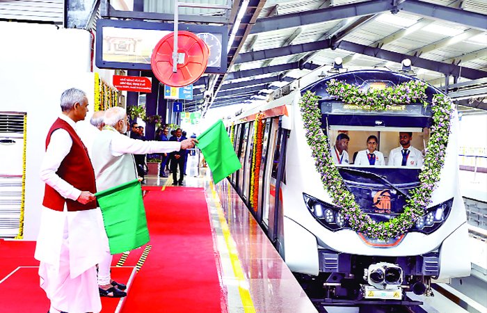 વડાપ્રધાન નરેન્દ્ર મોદી ગુજરાતના પ્રવાસે છે. આજે તેમણે સૂર્યઘર વીજળી યોજના હેઠળ સોલાર પેનલ લગાવેલા ઘરની વાવોલ ખાતે મુલાકાત કરી હતી અને ત્યારબાદ મહાત્મા મંદિર ખાતે ગ્લોબલ રિન્યુએબલ એનર્જી ઇન્વેસ્ટમેન્ટ મીટનું ઉદ્ઘાટન કર્યું હતું. હવે તેઓ ગાંધીનગર અને અમદાવાદ વચ્ચે દોડનારી મેટ્રો ટ્રેનનુ લોકાર્પણ કર્યું છે. આ લોકાર્પણ વેળાએ વડાપ્રધાન મોદી સાથે રાજ્યપાલ આચાર્ય દેવવ્રત અને મુખ્યમંત્રી ભૂપેન્દ્ર પટેલ પણ જોડાયા હતા. વડાપ્રધાને મેટ્રો ટ્રેનમાં સેક્ટર-1થી ગિફ્ટ સિટી સુધી મુસાફરી કરી હતી આ દરમિયાન તેમણે ટ્રેનમાં બાળકો સાથે મુક્તમને વાતો પણ કરી હતી.