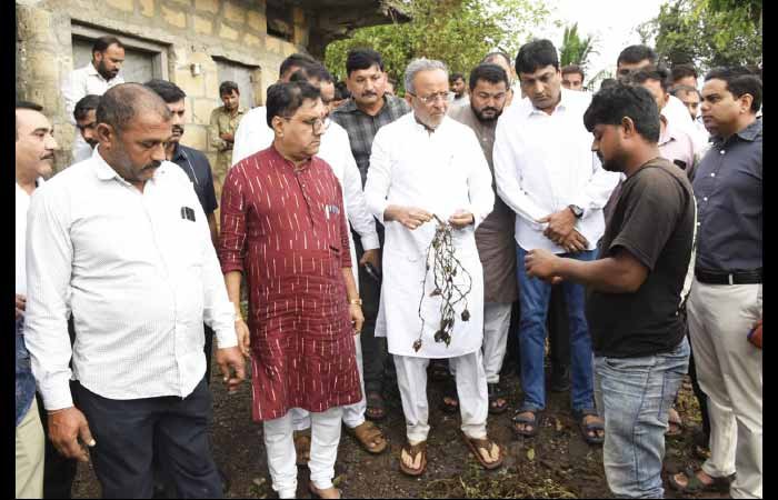 વન અને પર્યાવરણ મંત્રી અર્જુનભાઈ મોઢવાડિયા અને સામાજિક ન્યાય અને અધિકારીતા મંત્રી ડો. પ્રદ્યુમન વાજાએ વરસાદથી અસરગ્રસ્ત જૂનાગઢ જિલ્લાના મેંદરડા તાલુકાના ખડપીપળી ગામની મુલાકાત લીધી હતી. મંત્રીઓએ ખેડૂતોના ખેતરમાં જઈને કમોસમી વરસાદને કારણે મગફળી સહિતના પાકોને થયેલા નુકસાનનું નિરીક્ષણ કર્યું હતું અને ખેડૂતોની રજૂઆતો સાંભળી હતી.