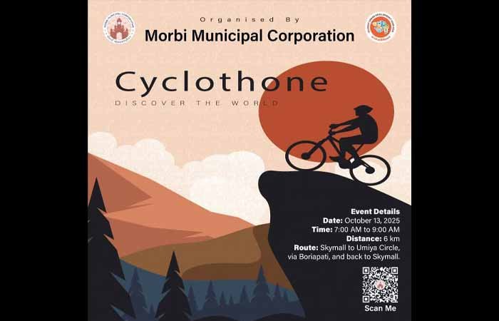 મોરબી મહાનગરપાલિકા દ્વારા આયોજિત વિકાસ સપ્તાહ 2025ના ભાગરૂપે સાયક્લોથોન (Cyclothon)નું આયોજન કરવામાં આવ્યું છે, જેના માટે રજીસ્ટ્રેશન પ્રક્રિયા શરૂ થઈ ચૂકી છે. આ સાયક્લોથોન તારીખ 13/10/2025 ને સોમવારના રોજ સવારે 07:00 થી 09:00 કલાક દરમિયાન યોજાશે, જેમાં સ્પર્ધકોએ 06 કિલોમીટરનું અંતર સાયકલિંગ કરવાનું રહેશે. સાયકલિંગનો રૂટ શનાળા રોડ પર આવેલ સ્કાયમોલથી શરૂ થઈને ઉમિયા સર્કલ, બોરિયાપાટી થઈને પરત સ્કાયમોલ ખાતે પૂર્ણ થશે. કાર્યક્રમમાં ભાગ લેવા માટે દરેક સ્પર્ધક માટે સાયકલ અને હેલ્મેટ ફરજિયાત છે, અને દરેક વ્યક્તિએ અલગથી ફોર્મ ભરવું જરૂરી છે. રજીસ્ટ્રેશન માટેની ડેડલાઇન 12 ઓક્ટોબર 2025 (રવિવાર) સુધીની રાખવામાં આવી છે.રજીસ્ટ્રેશન લિંક: વિિંાંત://રજ્ઞળિત.લહય/લઉંઝદૠખસશઇંસછિઈંડ્ઢઇુ8