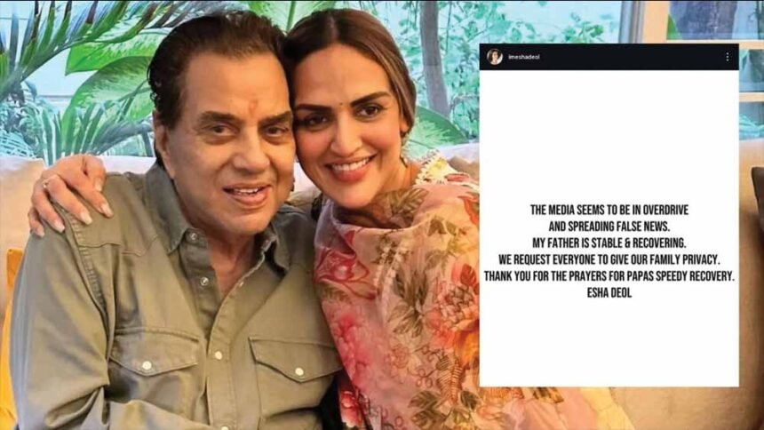 એશા દેઓલે ધર્મેન્દ્રના મૃત્યુની અફવાઓને એક મજબૂત સોશિયલ મીડિયા પોસ્ટ સાથે રદિયો આપ્યો છે જે પુષ્ટિ કરે છે કે તે સ્થિર છે અને સ્વસ્થ છે. તેમના સ્વાસ્થ્ય વિશે વધુ જાણવા માટે આગળ વાંચો.