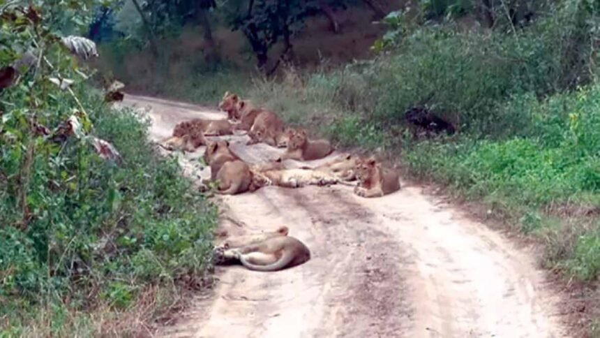 સાસણ ગીરમાં સફારી રૂટ પર એક-બે નહીં પણ એકસાથે 11 સિંહોનો આરામ