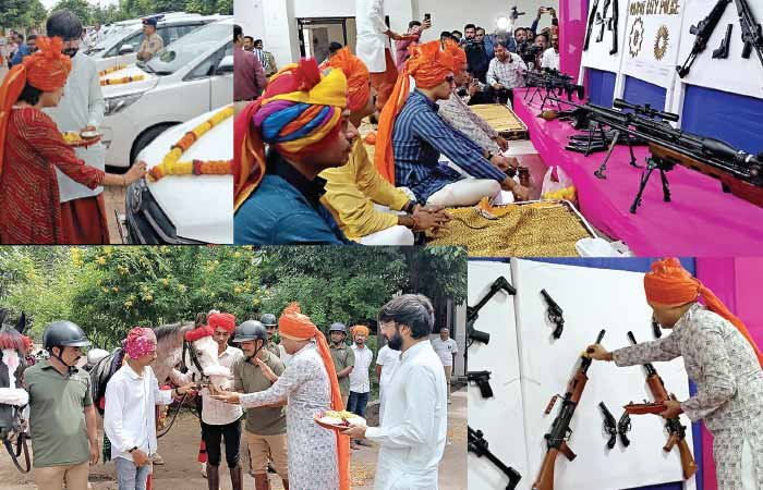 આજે આસુરી શક્તિ ઉપર સુરી શક્તિનો વિજય એટલે વિજયાદશમી આ પર્વ નિમિતે ધર્મની રક્ષા કાજે ઉપયોગમાં લેવામાં હથિયારો એટલે કે શસ્ત્રોનું વિધિ વિધાન મુજબ પૂજન કરવામાં આવતું હોય છે ત્યારે રાજકોટ શહેર પોલીસ હેડ ક્વાટર ખાતે પણ પોલીસ દળમાં ઉપયોગમાં લેવાતા હથિયારોનું શાસ્ત્રોક્ત વિધિ પ્રમાણે પૂજન કરવામાં આવ્યું હતું આ તકે દેશભરમાં શાંતિ અને સલામતી જળવાઈ રહે તેવી ડીસીપીએ પ્રાર્થના કરી હતી.