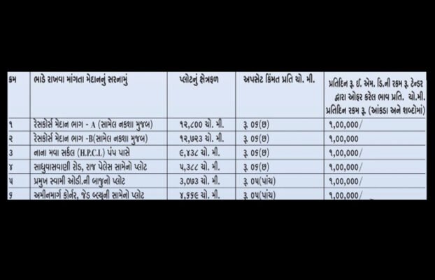 આ સિવાય નાના મવા ચોક, અમીનમાર્ગ કોર્નર, પ્રમુખ સ્વામી ઓડિટોરિયમની બાજુમાં અને સાધુવાસવાણી રોડ એમ કુલ છ મેદાન નવરાત્રિ માટે ભાડે આપવામાં આવે છે. ત્યારે આજરોજ ભાવપત્રક બહાર પાડવામાં આવ્યું છે. તા. 13ના સવારે 11:30 કલાકે પ્રિ-બીડની મિટિંગ યોજાશે. અને ટેન્ડર ઈસ્યુ કરવાની છેલ્લી તાં. 17 રહેશે. તાં.20 ના સાંજે 6 વાગ્યા સુધીમાં ટેન્ડર પહોંચતું કરવાનું રહેશે.