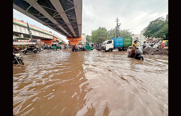 રાજકોટમાં કેટલાક માર્ગો તો બે કાંઠે વહેવા લાગ્યા હતા. વરસાદી પાણીના નિકાલના કામો માટે અને રસ્તાકામો માટે કરોડો રૂૂમ.નું આંધણ મહાપાલિકા દ્વારા કરાય છે પરંતુ, તેમ છતાં રસ્તા લેવલ વગરના રહે છે અને સામાન્ય વરસાદે પાણી એટલું ભરાય છે કે રાહદારીઓ તેમજ વાહનચાલકોએ પસાર થવું પણ મૂશ્ર્કેલ બની જાય છે.