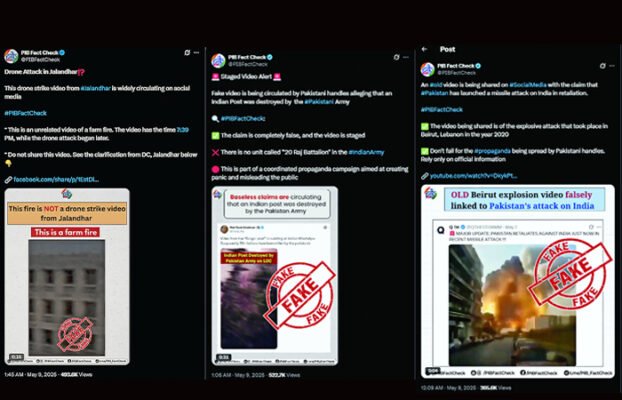 સામાન્ય રીતે ચોક્કસ સોશિયલ મીડિયા હેન્ડલ્સ અને ખાસ કરીને પાકિસ્તાનના મુખ્ય પ્રવાહના મીડિયા દ્વારા ખોટી માહિતીનો સંકલિત પ્રવાહ ફેલાયો છે. જેનો એકમાત્ર ઉદ્દેશ્ય ભારતીય જનતામાં ભય પેદા કરવાનો છે. છેલ્લા કેટલાક અઠવાડિયાથી પ્રેસ ઇન્ફોર્મેશન બ્યૂરો (ઙઈંઇ) દ્વારા આ મનોવૈજ્ઞાનિક યુદ્ધનો સક્રિયપણે ઇનકાર કરવામાં આવ્યો છે. વધુમાં, ભારતીય મીડિયા અને સોશિયલ મીડિયા યુઝર્સ ખોટી માહિતીનો શિકાર બની રહ્યા છે. ઙઈંઇનું ફેક્ટ-ચેક યુનિટ રેકોર્ડ ચેક કરે છે અને ખોટી માહિતી અને સીધા જુઠાણાનો પર્દાફાશ કરે છે. 8 મે, 2025ના રોજ 2200 કલાકથી 0630 કલાકની વચ્ચે કુલ સાત વિડિયોની ખરાઈ કરવામાં આવી હતી. હકીકત તપાસવામાં આવેલા વિડિયોની યાદી, તેમની લિંક્સ સાથે નીચે સંકલિત કરવામાં આવી છે: