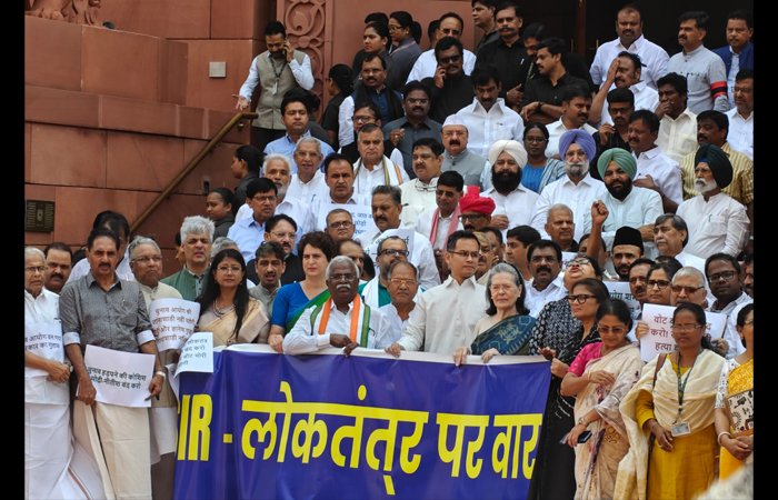 આ તરફ સંસદની બહાર મકરદ્વાર ખાતે બિહાર મતદાર ચકાસણીના મુદ્દા પર સતત ત્રીજા દિવસે વિરોધપ્રદર્શન કરવામાં આવ્યું હતું. સોનિયા ગાંધીએ પણ એમાં ભાગ લીધો હતો. પ્રિયંકા ગાંધીએ ‘લોકશાહી જોખમમાં’ લખેલું પોસ્ટર લહેરાવ્યું હતું.