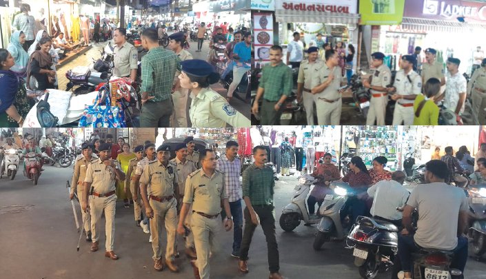 ત્યારે એ ડીવીઝન પોલીસ મથકના પીઆઈ આર જી બારોટ અને તેમની ટીમ દ્વારા સાંજે મુખ્ય રોડ ઉપર ફૂટ પેટ્રોલિંગ કરવામાં આવ્યું હતું આ તકે પીઆઈ બારોટ દ્વારા પેટ્રોલિંગ કરતાંની સાથે સાથે જ માઈક મારફ્તે બજારમાં ખરીદી કરવા આવતા લોકોને પોતાનો કીમતી સામાન જેવા કે દાગીના, પર્સ, મોબાઈલ સહિતની વસ્તુઓ સાચવીને રાખવા તાકીદ કરવામાં આવી હતી તેમજ બાળકોનું પણ ધ્યાન રાખવા અને ચોરીના બનાવો ન બને તે માટે વાહન સલામત સ્થળે લોક કરીને પાર્ક કરવા અનુરોધ કર્યો હતો આ ઉપરાંત લોકોમાં જાગૃતિ આવે તે માટે પેમ્પ્લેટનું પણ વિતરણ કરવામાં આવ્યું હતું તેમજ કોઈ ધક્કામુક્કી કરતુ શકમંદ જણાય તો તુરંત 100 નંબર ઉપર ફોન કરવા અનુરોધ કરવામાં આવ્યો છે.