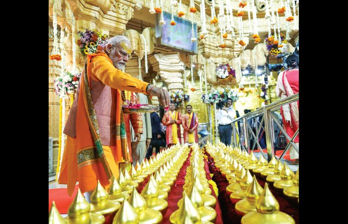 વડાપ્રધાન અને સુપ્રસિદ્ધ સોમનાથ મંદિર ટ્રસ્ટના અધ્યક્ષ નરેન્દ્ર મોદી આજે તેમનો સંકલ્પ પુર્ણ કરવા સોમનાથ મહાદેવના દર્શનાર્થે પધાર્યા હતા. જ્યાં તેઓએ 1766 સુવર્ણ કળશની દાતાઓ વતી વિશેષ પૂજા કરી હતી. સોમનાથ મહાદેવ મંદિરના શિખર પરના અંદાજે 1766 કળશને સુવર્ણ મંદિત કરવાની યોજના મંદિર ટ્રસ્ટ દ્વારા યોજાઈ હતી. જે અંતર્ગત દાતાઓના સહકારથી સુવર્ણ કળશ નિર્માણ થઈ ચૂક્યા હતા અને મોટા ભાગના દાતાઓના હસ્તે સુવર્ણ કળશની પૂજા કરી મંદિર શિખર પર રોપિત કરી દેવાયા હતા. પરંતુ અનેક દાતાઓ સુવર્ણ કળશની પૂજા માટે પહોંચી શક્યા ન હતા. પૂજા વિધિ વિના કળશ મંદિત ન કરી શકાય, માટે બાકી રહેતા તમામ કળશના દાતાઓ વતી આજે PM નરેન્દ્ર મોદીએ પૂજા કરી હતી. વડાપ્રધાન નરેન્દ્ર મોદીએ પોતાએ મનોમન લીધો મહાકુંભના સંકલ્પ મુજબ મહાદેવને શીશ ઝુકાવી ગંગાજળાભિષેક કર્યો હતો. બાદમાં પૂજારીઓ દ્વારા ઙખ મોદીને સોમેશ્વર મહાપૂજા કરાવવામાં આવી હતી. આ તકે ઙખ મોદીએ દેશની ઉન્નતિ અને દેશવાસીઓના કલ્યાણની પ્રાર્થના કરી હતી. ઉલ્લેખનિય છે કે, ઙખ મોદી તેમના સોમનાથના કાર્યક્રમના નિયત સમય કરતાં બે કલાક જેવા મોડા પહોંચ્યા હતા. જેથી અન્ય કોઈ લોકાર્પણ-ખાતમુર્હત કાર્યક્રમમાં સહભાગી થયા ન હતા. મંદિરમાં પૂજા-અર્ચના કર્યા બાદ તેઓ સાસણ ખાતે ‘વિશ્વ વન્યજીવ દિવસ’ની ઉજવણીમાં સહભાગી થવા માટે હેલીકોપ્ટર માર્ગે રવાના થયા હતા. વડાપ્રધાન મોદીના આગમનના સમાચાર મળતા જ મંદિર પરિસરમાં રહેલા દર્શનાર્થીઓ વડાપ્રધાન મોદીનું અભિવાદન ઝીલ્યું હતું. વડાપ્રધાને ખાસ કેસરી પોષક સાથે મહાદેવના દર્શન કર્યા હતા.