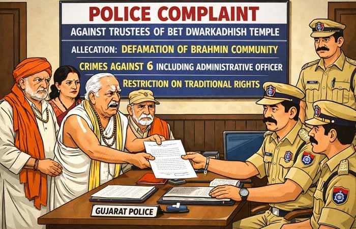 બેટ દ્વારકાધીશ મંદિરના વહીવટી અધિકારી અને ટ્રસ્ટીઓ વિરુદ્ધ બ્રાહ્મણ જ્ઞાતિની માનહાનિ કરવા અને તેમના પરંપરાગત અધિકારો છીનવી લેવા અંગેની એક ગંભીર પોલીસ ફરિયાદ દેવભૂમિ દ્વારકા જિલ્લાના બેટ દ્વારકા પોલીસ સ્ટેશનમાં નોંધાઈ છે. આ ફરિયાદ ભગવાન દ્વારકાધીશના પરમ ભક્ત અને પેઢી દર પેઢી યજમાનવૃતિ સાથે જોડાયેલા ભગવતપ્રસાદ જયંતિલાલ પાઢ દ્વારા કરવામાં આવી છે. ફરિયાદમાં મંદિરના વહીવટી અધિકારી મયુરસિંહ વાળા, ઉપપ્રમુખ સમીરભાઈ પટેલ અને અન્ય ચાર સ્થાનિક ટ્રસ્ટીઓ – હેમંતસિંહ વાઢેર, ધનજીભાઈ કોઠીયા, કાંતિલાલ પટ્ટ અને પ્રમોદરાય ભટ્ટને મુખ્ય આરોપી તરીકે દર્શાવવામાં આવ્યા છે. ફરિયાદની વિગતવાર હકીકત મુજબ, બેટ દ્વારકાધીશ મંદિરમાં વર્ષોથી ચાલી આવતી પરંપરા અને મંદિરના બંધારણ અનુસાર, મંદિરની ઉપજ કે આવકનો ચાલીસ ટકા હિસ્સો બ્રાહ્મણ જ્ઞાતિના ફાળે જાય છે. આ હિસ્સા પર જ અનેક બ્રાહ્મણ પરિવારોનું ગુજરાન અને રોજીરોટી નિર્ભર છે. જોકે, તાજેતરમાં ઓખા અને બેટ દ્વારકાને જોડતા સિગ્નેચર બ્રિજનું નિર્માણ થયા બાદ મંદિરમાં યાત્રાળુઓનો પ્રવાહ ખૂબ વધી ગયો છે. આ નવી પરિસ્થિતિનો ગેરલાભ લઈને આરોપીઓએ પોતાની સત્તાનો દુરુપયોગ શરૂ કર્યો હોવાનો આક્ષેપ છે. ફરિયાદીના જણાવ્યા અનુસાર, ગત 25 ડિસેમ્બર 2025ના રોજ નાતાલના તહેવારોમાં ભીડ વધવાનું બહાનું બતાવી આરોપીઓએ બ્રાહ્મણોને મંદિરમાં પ્રવેશતા અટકાવી દીધા હતા. છેલ્લા પચ્ચીસ દિવસથી બ્રાહ્મણોને મંદિરમાં જઈને પોતાની ધાર્મિક વિધિઓ કે યજમાનવૃતિ કરવા દેવામાં આવતી નથી, જેના કારણે તેઓ આર્થિક સંકટમાં મુકાયા છે. આ કેસમાં સૌથી વધુ વિવાદિત બાબત આરોપીઓ દ્વારા કરવામાં આવેલા નિવેદનો છે. ફરિયાદમાં જણાવાયું છે કે આરોપીઓ પૈકીના પ્રમોદરાય ભટ્ટે વિવિધ સોશિયલ મીડિયા પ્લેટફોર્મ અને ન્યૂઝ ચેનલોમાં ઇન્ટરવ્યુ આપીને સમસ્ત બ્રાહ્મણ જ્ઞાતિની છબી ખરડવાનો પ્રયાસ કર્યો છે. તેમણે એવા નિવેદનો કર્યા હતા કે બ્રાહ્મણો મંદિરમાં આવીને ’ધંધો’ કરે છે અને યાત્રાળુઓને હેરાન કરે છે. વધુમાં, એવો દાવો પણ કરવામાં આવ્યો હતો કે બ્રાહ્મણો પરનો આ પ્રતિબંધ જિલ્લા પોલીસ વડા (ઉજઙ) ની સૂચનાથી લાદવામાં આવ્યો છે. ફરિયાદીએ આ બાબતે તપાસ કરતા માલૂમ પડ્યું હતું કે ઉજઙ સાહેબ દ્વારા આવો કોઈ હુકમ કરવામાં આવ્યો નથી. આમ, આરોપીઓએ પોલીસ તંત્રના નામે ખોટા મેસેજ વહેતા કરીને શ્રદ્ધાળુઓ અને યજમાનોમાં બ્રાહ્મણ જ્ઞાતિ પ્રત્યે અણગમો અને તિરસ્કાર પેદા કરવાનું કામ કર્યું છે, જે કાયદેસરની માનહાનિ સમાન છે. ફરિયાદીએ આ હેરાનગતિ પાછળનું એક મહત્વનું કારણ જૂની અદાવત પણ ગણાવ્યું છે. ફરિયાદી અને અન્ય જાગૃત નાગરિકોએ અગાઉ આ આરોપીઓ દ્વારા બેટ ગામની સરકારી જમીન (સર્વે નંબર 59 અને 21 પૈકી-1) પર કરવામાં આવેલા ગેરકાયદેસર દબાણ વિરુ