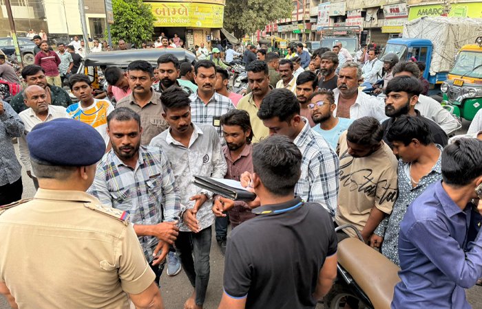 રાજકોટના રામનગરમાં આવેલા લોધેશ્વર સોસાયટીમાં રહેતા રવિ ભીખુભાઈ જરીયા ઉ.30 નામનો યુવક રાત્રે વિજય પ્લોટ તરફ જતો હતો ત્યારે પાછળથી અજાણ્યા ઈસમે સ્કુટરને ઠોકર મારતા જેથી યુવકે જોઈને ચલાવવાનું કહેતા શખસે તેના અન્ય સાગરીતોને બોલાવી રવિ સાથે ઝઘડો કરી ધોકા, લાકડી અને છરી વડે હુમલો કરતા જાહેર રોડ પર લોકોના ટોળા ઉમટી પડ્યા હતા હુમલાખોરો નાસી જતા ઈજાગ્રસ્ત યુવાનને સારવાર અર્થે સિવીલ હોસ્પિટલમાં ખસેડવામાં આવ્યો હતો બનાવનો વિડીયો સોશિયલ મિડીયામાં વાયરલ થતા એ ડિવીઝન પોલીસ મથકના પીઆઈ બી વી બોરીસાગર સહિતનો કાફલો દોડી ગયો હતો અને રાતોરાત જાહેરમાં હુમલો કરી તંગદિલી ફેલાવનાર કુખ્યાત આરોપી ફિરોઝ કરીમ કાથરોટિયા ઉ.20, સલીમ કરીમ કાથરોટિયા ઉ.26 અને પરેશ રમેશ વાઘેલા ઉ.19ને દબોચી લઇ આકરી સરભરા કરી કાયદાનું ભાન કરાવ્યું હતું જ્યારે કુખ્યાત ઈબ્રાહિમ ઉર્ફે ઇભલો પોલીસ પકડથી દૂર હોય તેની શોધખોળ હાથ ધરી છે ત્રણેયને ગોંડલ રોડ ઉપર જ્યાં રોફ જમાવ્યો હતો ત્યાં જ પોલીસે લઇ જઈ જાહેરમાં માફી મંગાવતા લુખ્ખાઓનું સરઘસ જોવા લોકોના ટોળા ઉમટયા હતા.