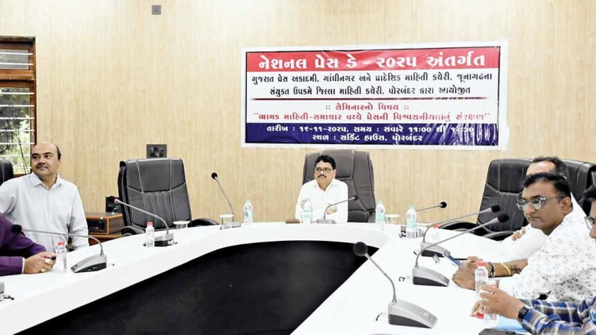પ્રેસ અકાદમી ગાંધીનગર તથા માહિતી ખાતા દ્વારા રાષ્ટ્રીય પ્રેસ દિવસની રાજ્યવ્યાપ્ત ઉજવણીના ભાગરૂપે પોરબંદર સર્કિટ હાઉસ ખાતે મહત્વપૂર્ણ પ્રેસ સેમિનાર યોજાયો હતો. ફેક ન્યૂઝ-ભ્રામક માહિતી વચ્ચે પ્રેસની વિશ્વસનીયતાનું સંરક્ષણ જેવા અત્યંત સમયસપેક્ષ વિષય પર પોરબંદરના મુખ્ય પત્રકારો, અધિકારીઓ અને મીડિયા પ્રતિનિધિઓએ ખુલ્લા મનથી ચર્ચા-વિમર્શ કર્યો હતો. કાર્યક્રમના મુખ્ય અતિથિ જિલ્લા વિકાસ અધિકારી બી.બી. ચૌધરીએ પત્રકારોને પ્રેસ ડેની શુભેચ્છા પાઠવી હતી. તેઓએ કહ્યું કે સોશિયલ મીડિયા યુગમાં જક્કાસ ઝડપે સમાચાર આપવાની દોડ વચ્ચે સત્ય અને અસત્યની રેખા ધૂંધળી થતી જાય છે. સાચી માહિતી જન-જન સુધી પહોંચાડવા પોરબંદર મીડિયા સતત કાર્યરત છે, જે પ્રશંસાપાત્ર છે. પત્રકારત્વનું ધ્યેય સાચા તથ્યોને આધારે જનહિતની વાત રજૂ કરવાનો છે અને આ દિશામાં મીડિયા સતત જાગૃત રહે તે જરૂરી છે. કાર્યક્રમમાં પ્રાદેશિક માહિતી કચેરી જૂનાગઢના નાયબ માહિતી નિયામક નરેશ મહેતાએ કાર્યક્રમનું સ્વાગત અને રૂપરેખા રજૂ કરી. પ્રેસ અકાદમીના સચિવ જયેશ દવે તથા મિતેશ મોડાસિયાએ પણ પ્રેસ ડે નિમિત્તે શુભેચ્છા પાઠવી હતી. અંતે જિલ્લા માહિતી કચેરીના માહિતી મદદનીશ દાસા કોડિયાતરે આભારવિધિ વ્યક્ત કરી હતી. કાર્યક્રમમાં પ્રિન્ટ અને ઇલેક્ટ્રોનિક મીડિયાના મુખ્ય પત્રકારો, તંત્રીઓ, સહતંત્રી, પ્રતિનિધિઓ અને માહિતી કચેરીના અધિકારીઓ મોટી સંખ્યામાં ઉપસ્થિત રહ્યા હતા.