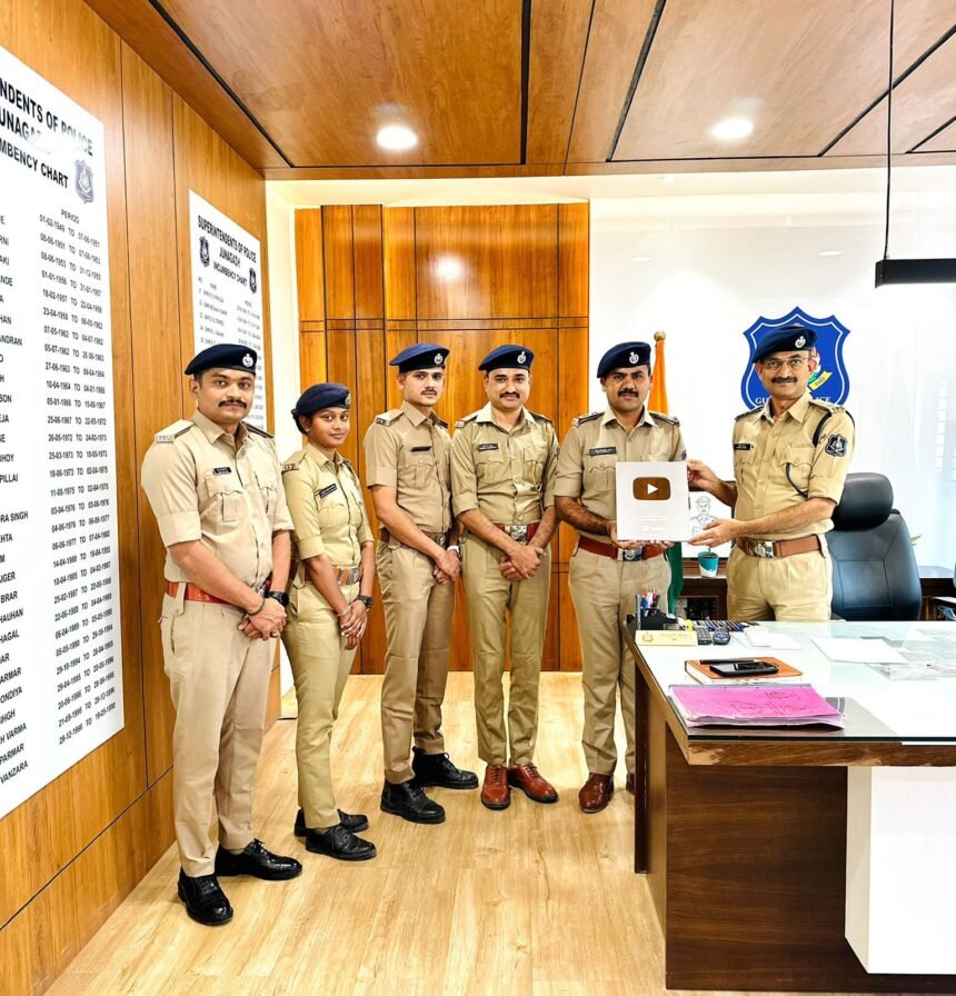 જૂનાગઢ પોલીસ પરિવાર દ્વારા શહેર થતા જિલ્લામાં ગેરકાયદેસર નશા કારક પદાર્થનું સેવન કરતા અને વેંચાણ કરતા ઈસમો સામે અનેકવાર ડ્રાઈવ યોજીને લોકોમાં અવરનેશ માટે જાગૃતિ ફેલાવી છે ત્યારે આજના યુગમાં સોશ્યલ મીડીયાના માધ્યમ યુવાનો વધુમાં વધુ જાગૃતિ આવે તેવા પ્રયાસ શરુ કર્યા છે.ત્યારે જૂનાગઢ પોલીસ દ્વારા સોશ્યલ મડિયાના પ્લેટફોર્મ પર એસપી જૂનાગઢ નામની આઈડી પર યુવાનો તથા વડીલો તેમજ સામાન્ય જીવન જીવતા લોકોમાં સાઇબર ક્રાઇમ તેમજ નશા કારક પદાર્થો વિષે યુ ટ્યુબ, ઇન્ટાગ્રામ, ફેસબુક સહીતના સોશ્યલ મીડિયા પ્લેટફોર્મ પર જાગૃતિ ફેલાવી રહ્યા છે.ત્યારે જૂનાગઢ પોલીસે આ નવતર અભિગમ લોકોને ખુબ પસંદ આવી રહ્યો છે.અને વધુમાં વધુ શહેરીજનો જોડાઈ રહ્યા છે.ત્યારે યુ ટ્યુબ પર એક લાખ ફોલોવર થતા સિલ્વર પ્લે બટન યુ ટ્યુબ ચેનલ દ્વારા જૂનાગઢ પોલીસને અર્પિત કરવામાં આવ્યું હતું.આજ રીતે રોજબરોજ પોલીસની આ અવરનેશ કામગીરી થી પ્રભાવિત થઇને વધુ જોડાતા થયા છે અને સરાહના કરી રહ્યા છે.