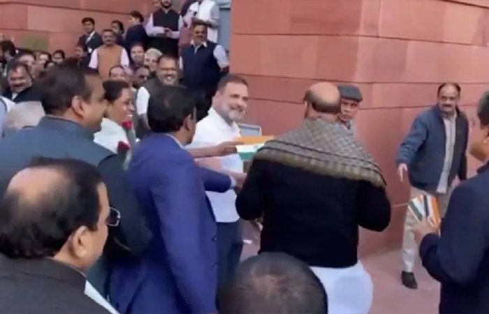 કોંગ્રેસે સંસદમાં વિરોધ કરવાનો અનોખો રસ્તો શોધી કાઢ્યો છે. કોંગ્રેસના સાંસદ અને લોકસભામાં વિરોધ પક્ષના નેતા, રાહુલ ગાંધીએ સંસદ સંકુલમાં સંરક્ષણ પ્રધાન રાજનાથ સિંહને ગુલાબના ફૂલ અને ત્રિરંગો અર્પણ કર્યો હતો.