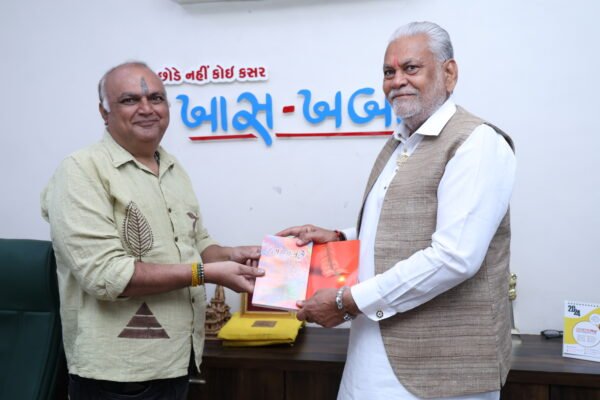 ખાસ-ખબરના તંત્રી કિન્નર આચાર્ય દ્વારા પરસોતમ રૂપાલાને બૂક અને બૂકેની ભેટ આપી હતી