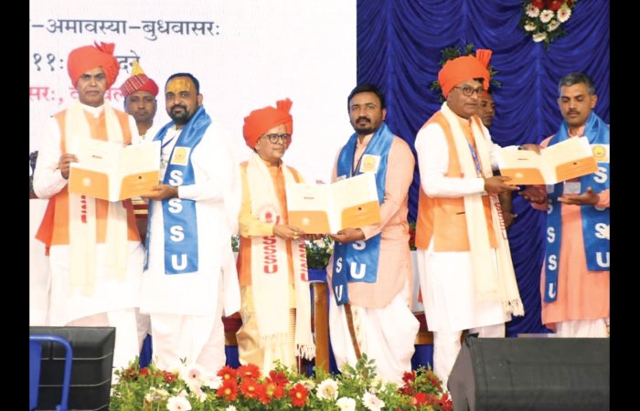 રાજ્યપાલ અને મહાનુભાવોના હસ્તે ગુજરાતનાં સંસ્કૃત વિદ્વાન ડો. વસંત પરીખને સરસ્વતીબેન જયંતિલાલ ભટ્ટ સંસ્કૃત વિદ્વાન-2025 પુરસ્કાર અને શોધાર્થી નિકુલ શાન્તિલાલ શીલુને ‘શોધવિભૂષણમ્’ પુરસ્કાર-2025 એનાયત કરવામાં આવ્યો હતો. આ દિક્ષાંત સમારોહમાં શાસ્ત્રી (બી.એ.)-340, આચાર્ય (એમ.એ.)-195, પી.જી.ડી.સી.એ.-169, શિક્ષાશાસ્ત્રી (બી.એડ.)-52 અને વિદ્યાવાચસ્પતિ (પીએચ.ડી.)-10 અને 23 ગોલ્ડમેડલ (સુવર્ણ પદક) અને 04 સિલ્વરમેડલ (રજત પદક) એમ કુલ મળીને 27 જેટલા પદકો સાથે કુલ 766 ડિગ્રી પ્રમાણપત્રો વિદ્યાર્થીઓને એનાયત કરવામાં આવ્યાં હતાં. આ અવસરે જિલ્લા કલેકટર દિગ્વિજયસિંહ જાડેજા, જિલ્લા વિકાસ અધિકારી સ્નેહલ ભાપકર, જિલ્લા પોલીસવડા મનોહરસિંહ જાડેજા, પ્રાંત અધિકારી વિનોદ જોશી, અગ્રણી મહેન્દ્રભાઈ પીઠિયા સહિત સંસ્કૃત યુનિવર્સિટીના પ્રધ્યાપકો, સંતો-મહંતો અને વિદ્યાર્થીઓ ઉપસ્થિત રહ્યાં હતાં