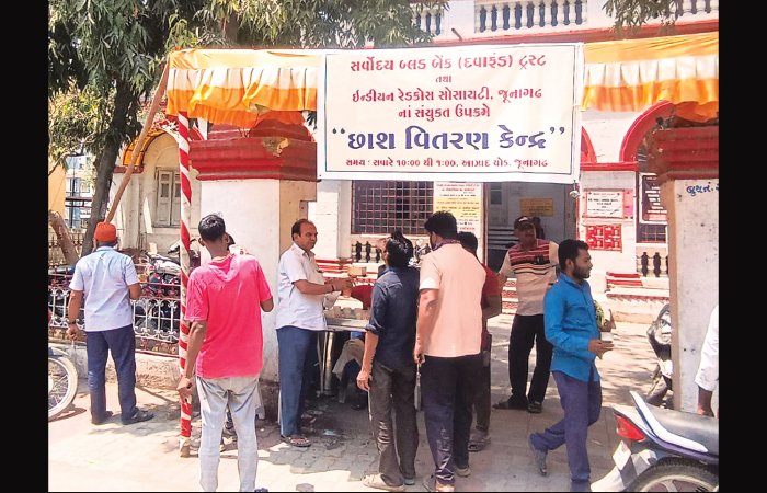 દિન પ્રતિદિન વધતી ગરમીના તીવ્ર પ્રહારો સામે રસ્તે ચાલતા રાહદારીઓને આરામદાયક છાંયો આપવા, જૂનાગઢ સર્વોદય બ્લડ બેન્ક દવા ફંડ અને ઇન્ડિયન રેડ ક્રોસ સોસાયટી જૂનાગઢ શાખાના સંયુક્ત ઉપક્રમે એક માનવતાભર્યો અને સંવેદનશીલ ઉપક્રમ હાથ ધરવામાં આવ્યો છે ત્યારે ખાસ વિનામૂલ્યે ઠંડી છાશ વિતરણ કેન્દ્રની શરૂઆત કરવામાં આવી છે.