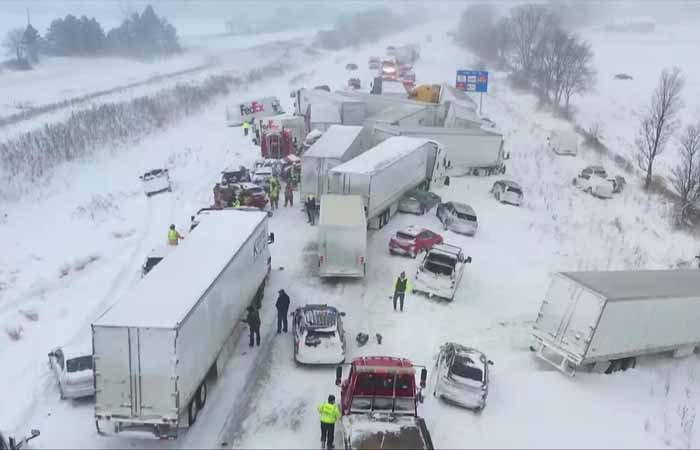 અમેરિકાના મિશિગન રાજ્યમાં બરફના તોફાનને કારણે એક ભયાનક માર્ગ અકસ્માત સર્જાયો છે, જેમાં એક ઇન્ટરસ્ટેટ હાઇવે પર 100થી વધુ ગાડીઓ એકબીજા સાથે અથડાઈ હતી. આ દુર્ઘટનામાં 30થી વધુ સેમી-ટ્રેલર ટ્રક પણ ફસાયેલા છે. અકસ્માતની ગંભીરતાને જોતાં પોલીસે હાઈવેના બંને તરફનો ટ્રાફિક બંધ કરી દીધો છે.