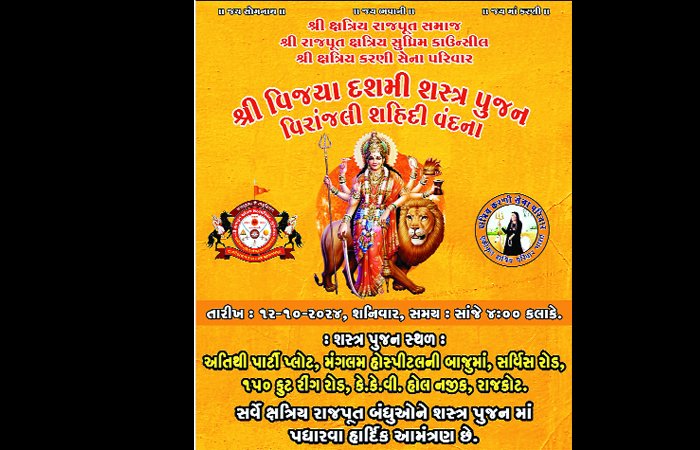 રાજકોટ ખાતે આગામી વિજયા દશમી (દશેરા) નિમિતે શ્રી ક્ષત્રિય રાજપૂત સમાજ, શ્રી રાજપૂત ક્ષત્રિય સુપ્રિમ કાઉન્સિલ તથા શ્રી ક્ષત્રિય કરણી સેના દ્વારા પરંપરાગત શસ્ત્ર પૂજન તથા વીરાંજલી શહીદ વંદના યોજાશે.શસ્ત્ર પુજન તથા વીરાંજલી કાર્યક્રમ વિજયા દશમી તા. 12/10/2024 શનિવાર સાંજે 04:00 વાગ્યે, અતિથિ પાર્ટી પ્લોટ, મંગલમ હોસ્પિટલ પાસે, 150 ફૂટ રીંગ રોડ સર્વીસ રોડ, રાજકોટ ખાતે યોજાશે.