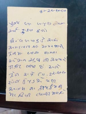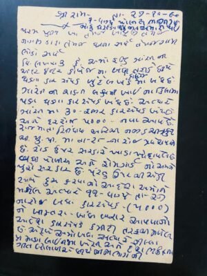 પુ.બા બાપુજી તેમજ સર્વે કુશળ હશો વી.સાથ લખવાનું કે અમે અમદાવાદથી સાબરમતી રેલવે સ્ટેશનથી બીના નામના સ્ટેશન સુધીની અત્યારે ટિકીટ લીધી છે અને ટ્રેન રાત્રે 8:30 વાગ્યે 22.10.1990ના રોજ ઉપડશે પછી આગળના કાર્યક્મની માહિતી ત્યાંથી મળશે. અને ચિંતાનું કોઇ કારણ નથી અમદાવાદ અત્યારે અમે હજારોની સંખ્યામાં કાર સેવકો જઇ રહ્યા છીએ. હવે પછી ટપાલ પાછી લખીશુ. લી.કનુભાઇ તથા ભાણજીભાઇ દરજી, ભગત અશોકભાઇના પ્રણામ… લી.કનુભાઇ ભાલાળા