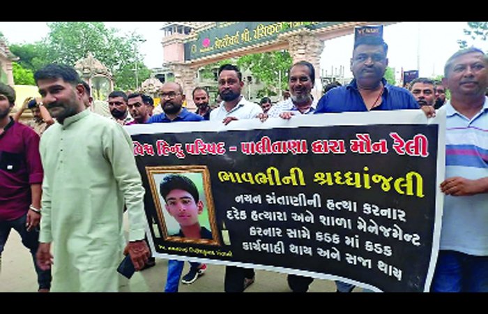 અમદાવાદની સેવન્થ ડે સ્કૂલના વિદ્યાર્થીની અન્ય વિદ્યાર્થી દ્વારા કરાયેલી હત્યાના ઘટનાને લઈને સમગ્ર રાજ્યમાં રોષ ફેલાયો છે. આ ઘટનાના વિરોધમાં પાલીતાણામાં વિશ્વ હિન્દુ પરિષદ, બજરંગ દળ અને સિંધી સમાજ દ્વારા મૌન રેલી યોજી ડેપ્યુટી કલેક્ટર કચેરી ખાતે આવેદનપત્ર પાઠવવામાં આવ્યું હતું. રેલી દરમિયાન આરોપી તેમજ સ્કૂલ મેનેજમેન્ટ વિરુદ્ધ કડક પગલાં લેવા માંગ ઉઠી હતી. યુવકના મોત બાદ લોકોમાં ઉગ્ર પ્રતિક્રિયા જોવા મળી હતી અને આવી દુ:ખદ ઘટના ફરી ક્યાંય ન બને તે માટે સરકાર તકેદારી રાખે તેવી પણ માંગણી કરવામાં આવી હતી. આ મૌન રેલીમાં વિવિધ આગેવાનો અને કાર્યકરો મોટી સંખ્યામાં જોડાયા હતા.