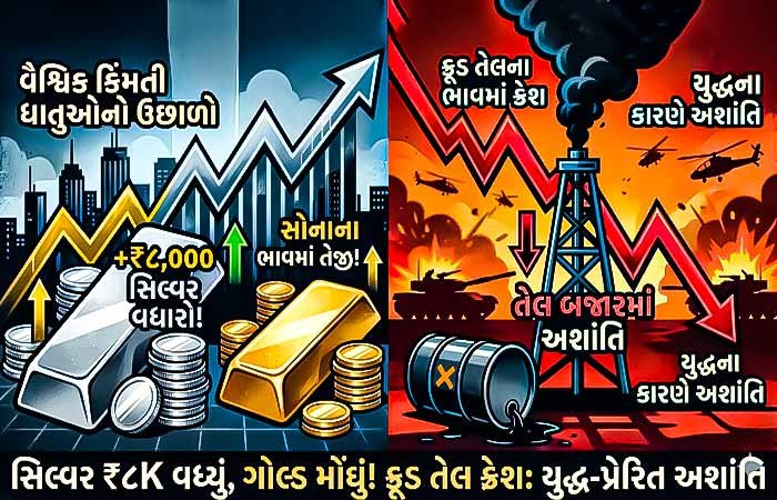 ચાંદીમાં 8 હજારનો ભાવવધારો, સોનું પણ થયું મોંઘું! ક્રૂડ ઓઈલની કિંમત ક્રેશ: યુદ્ધ વચ્ચે ઉથલપાથલ