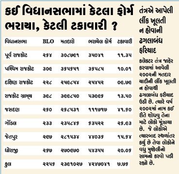 રાજકોટ શહેરમાં 2002ની સ્થિતીએ નવી બનેલી બે વિધાનસભામાં મતદારોને સૌથી કડાકૂટ છે. નવી બેઠક હોવાના કારણે જે તે સમયે વિસ્તાર અને સોસાયટીઓનું અસ્તિત્વ હતું પરંતુ ત્યારે મતદાર કઈ બેઠકમાં મતદાન કરતો હતો તેની સચોટ માહિતી નહીં હોવાથી બે દિવસના કરવામાં આવેલ કેમ્પમાં પણ મતદાર યાદીમાં નામ હોવા છતા મતદારોને રામાયણ થઈ હતી. આથી આ વિસ્તારના મતદાન મથક ઉપર મોટી સંખ્યામાં મતદારોના ટોળા ઉમટ્યા હતા.,રાજકોટ જિલ્લાના ગ્રામ્ય વિસ્તારમાં જઈંછની કામગીરી ઝડપ પકડી છે. જસદણ વિસ્તારમાં 41 ટકાથી વધુની કામગીરી આટોપી લેવામાં આવી છે. 2.68 લાખ મતદારોમાંથી 1.11 લાખ મતદારોએ ફોર્મ ભરીને પર આપી દીધા છે. આવી જ રીતના ગોંડલ, જેતપુરના બીએલઓ દ્વારા શ્રેષ્ઠ કામગીરી કરવામાં આવી છે. જ્યારે રાજકોટ શહેરની દક્ષિણ અને પશ્ચિમ બેઠકમાં સૌથી ઓછી અને અંત્યત નબળી કામગીરી છે.
