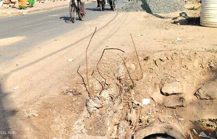 રોડમાંથી નીકળેલા ઊભા સળિયાથી રાત્રીના સમયે અકસ્માતના એંધાણ