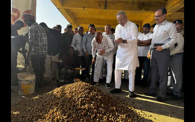 પોરબંદર માર્કેટિંગ યાર્ડ(APMC)ખાતે વન અને પર્યાવરણ, ક્લાઈમેટ ચેન્જ, સાયન્સ અને ટેકનોલોજી વિભાગના કેબિનેટ મંત્રી અર્જુનભાઈ મોઢવાડિયાના હસ્તે ટેકાના ભાવે મગફળી ખરીદી પ્રક્રિયાનો સત્તાવાર પ્રારંભ કરવામાં આવ્યો હતો. મંત્રી અર્જુનભાઈ મોઢવાડિયાએ જણાવ્યું હતું કે, આ વખતે કમોસમી વરસાદના કારણે ખેડૂતોને નુકસાન સહન કરવું પડ્યું છે, છતાં રાજ્યમાં લગભગ 60 લાખ ટન જેટલી મગફળીના ઉત્પાદનની શક્યતા છે. અત્યાર સુધીમાં આશરે 9 લાખ જેટલા ખેડૂત ભાઈઓએ ટેકાના ભાવે મગફળી વેચવા માટે રજીસ્ટ્રેશન કરાવ્યું છે. મોઢવાડિયાએ વધુમાં જણાવ્યું હતું કે, રાજ્ય સરકારે ખેડૂતોના હિતમાં ઉદાર નિર્ણય લઈ લગભગ 20 લાખ ટન જેટલી મગફળીની ટેકાના ભાવે ખરીદી કરવાનો નિર્ણય કર્યો છે. સાથે જ પ્રતિ મણ રૂ. 1452 જેટલો ઉચ્ચ ટેકાનો ભાવ નક્કી કરવામાં આવ્યો છે, જેથી ખેડૂતોને યોગ્ય વળતર મળી શકે. તેમણે ઉમેર્યું કે, રાજ્ય સરકાર ખેડૂતોની પાછળ મજબૂતપણે ઊભી છે અને કુલ ₹15,000 કરોડથી વધુના ખર્ચે મગફળી ઉપરાંત મગ, અડદ અને સોયાબીનની ટેકાના ભાવે ખરીદી હાથ ધરવામાં આવશે. જે કાર્યક્રમમાં પોરબંદર માર્કેટિંગ યાર્ડના અધિકારીઓ, સહકારી સંસ્થાઓના પ્રતિનિધિઓ, ખેડૂતો તેમજ સ્થાનિક જનપ્રતિનિધિઓ મોટી સંખ્યામાં હાજર રહ્યા હતા.