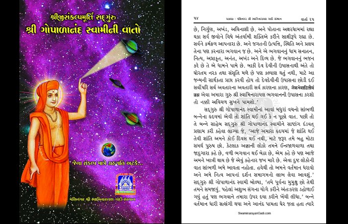 હવે આ આખી ગપગોળા વાળી વાર્તા શું કહેવા માંગે છે એનું મૂળ મળે છે વડતાલ ગાદી સાથે સંકળાયેલ કુંડળધામ અને શ્રીસ્વામિનારાયણ મંદિર, કારેલીબાગ-વડોદરા દ્વારા પ્રકાશિત ‘અક્ષરાનંદ સ્વામીની વાતો’ પુસ્તકમાં. એ પુસ્તકના પાના નંબર 419 અને 420 પર સહજાનંદ સ્વામી અને ગોપાળાનંદ સ્વામીનો એક સંવાદ આપેલો છે. તે લખાણ નીચે મુજબ છે: