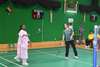 રાષ્ટ્રપતિ મુર્મુ બેડમિન્ટન કોર્ટમાં ઉતર્યા: સાયના નેહવાલ સાથે બેડમિન્ટન રમ્યા
