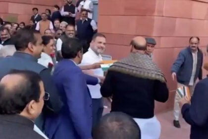 રાહુલ ગાંધીએ સંસદની બહાર રાજનાથ સિંહને ગુલાબ, ત્રિરંગો અર્પણ કર્યો