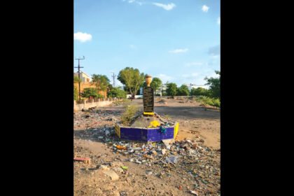 શીલાલેખ, સ્તંભ જર્જરિત, સ્તંભ આસપાસ બાવળોના ઝૂંડ અને ગંદકી જોવા મળે છે,…