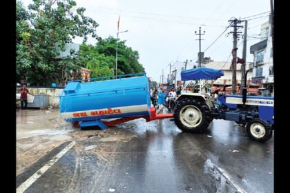 ઊનામાં પાણીનું ટેન્કર ખાડામાં ખૂંચ્યું: ટ્રાફિક જામનાં દ્રશ્યોે સર્જાયા