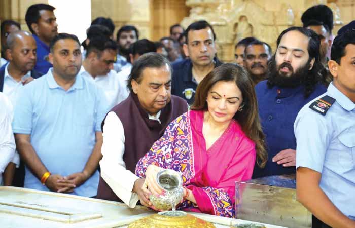રિલાયન્સ ઇન્ડસ્ટ્રીઝના ચેરમેન મુકેશભાઈ અંબાણીએ પરિવાર સાથે સોમનાથ મહાદેવના ચરણોમાં શીશ ઝુકાવ્યું હતું. જનસુખાકારી અને યાત્રી સુવિધા અર્થે રૂ. 5 કરોડ ‘શિવાર્પણ’ કર્યા હતા. વિશ્ર્વભરના સનાતન ધર્મીઓના આસ્થાના પરમ કેન્દ્ર અને પ્રથમ જ્યોતિર્લિંગ એવા સોમનાથ મહાદેવના પાવન સાનિધ્યમાં વર્ષ 2026ના પ્રારંભિક દિવસોમાં શ્રદ્ધા અને ભક્તિનો એક અલૌકિક માહોલ સર્જાયો હતો. ભારતીય ઉદ્યોગજગતના શિરમોર અને રિલાયન્સ પરિવારના મોભી, ચેરમેન અને મેનેજિંગ ડિરેક્ટર એવા મુકેશભાઈ અંબાણી રિલાયન્સ ફાઉન્ડેશનના સ્થાપક નીતાબેન અંબાણી અને એક્ઝિક્યુટિવ ડિરેક્ટર અનંતભાઈ અંબાણીએ સહપરિવાર દેવાધિદેવ સોમનાથ મહાદેવના પાવનકારી દર્શન કર્યા હતા. નૂતન વર્ષના મંગલમય પ્રારંભે સોમનાથ મંદિરમાં અંબાણી પરિવારે મહાદેવને ગંગાજલ અભિષેક કરી, પૂજા સામગ્રી અર્પણ કરી હતી. આ પુનિત અવસરે તેઓએ વેદોક્ત મંત્રોચ્ચાર સાથે સોમનાથ દાદાની કુલસોમેશ્ર્વર મહા પૂજા કરી હતી. આ ઉપરાંત, ’ધ્વજા પૂજા’ અને ભક્તોમાં જેનું વિશેષ મહત્વ છે તેવી ’પાઘ પૂજા’ કરીને રાષ્ટ્રની સુખ, શાંતિ અને સમૃદ્ધિ માટે પ્રાર્થના કરી હતી. દર્શન બાદ, સમગ્ર પરિવારે ભારતીય પ્રાચીન સંસ્કૃતિના વિજ્ઞાનિક અને ભૌગોલિક વારસાના અદભુત પ્રતિક સમાન ‘બાણ સ્તંભ’ની મુલાકાત લીધી હતી. જ્યાથી પૃથ્વીના દક્ષિણ ધ્રુવ સુધી કોઈ ભૂમિ ભાગ નથી આવતો તેવા અબાધિત સમુદ્રમાર્ગ દર્શાવતા આ સ્તંભને નિહાળી અંબાણી પરિવારે ભારતની ભવ્ય વૈજ્ઞાનિક વિરાસત પ્રત્યે ગૌરવ વ્યક્ત કર્યું હતું. સેવા પરમો ધર્મની ભાવનાને સાર્થક કરતા મુકેશભાઈ અંબાણીએ સોમનાથ ટ્રસ્ટ દ્વારા ચાલતા લોક કલ્યાણના કાર્યો અને કરોડો શ્રદ્ધાળુઓ માટેની યાત્રીલક્ષી સુવિધાઓના વિકાસ કાર્યો હેતુ રૂૂ. 5 કરોડ ‘શિવાર્પણ’ કર્યું હતું. આ પ્રસંગે સોમનાથ ટ્રસ્ટ પરિવાર તરફથી ઇન્ચાર્જ જનરલ મેનેજર પરેશભાઈ ચાવડા એ અંબાણી પરિવારનું સ્વાગત અને અભિવાદન કર્યું હતું.