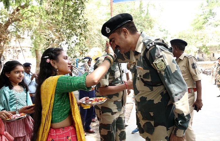 જૂનાગઢ લોકસભા સામાન્ય ચૂંટણી આગામી 7મેના રોજ યોજાવાની છે ત્યારે ચૂંટણી શાંતિપૂર્ણ વાતાવરણમાં યોજાઈ અને લોકો ભય વગર મતદાન કરે તેના માટે પોલીસ ચુસ્ત બંદોબસ્ત સાથે બીએસએફ જવાનો પણ ચૂંટણી ફરજ બજાવશે ત્યારે લોકસભા ચૂંટણી અન્વયે જૂનાગઢ હેડક્વાર્ટર ખાતે બીએસએફ જવાનો બંદોબસ્ત માટે પધાર્યા ત્યારે તેમનું બાળાઓ દ્વારા કુમકુમ તિલક કરી ફૂલડેથી વધવામાં આવ્યા હતા અને પોલીસ બેન્ડની સુરાવલી સાથે ઉષ્મા ભર્યું સ્વાગત કરવામાં આવ્યું હતું.
