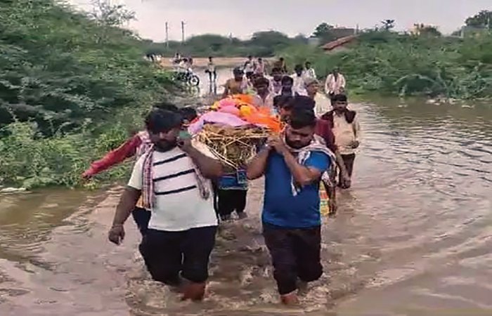 રાજ્યમાં સાતમ આઠમ સમય દરમિયાન પડેલા ભારે વરસાદને લીધે ઠેર ઠેર નદી નાળા અને તળાવો ઓવરફ્લો થયા હતા જેથી અનેક રહેણાક વિસ્તારોમાં પાણી ભરાયાં હતા તેવામાં સુરેન્દ્રનગર શહેરના વોર્ડ નંબર 5માં આવેલા ચામુંડા પરા સોસાયટી ખાતે છેલ્લા પંદર દિવસથી ભરાયેલા વરસાદી પાણીને લીધે સ્થાનિકોને ભારે પર્ષણી થઈ રહી છે સાથે જ પંદરેક દુવસ્થી પાણી ભરાયેલા હોવા છતા સ્થાનિક તંત્ર દ્વારા કોઈ પણ જાતના પગલાં નહિ ભરાતા રહીશો પણ ભારે મુશ્કેલીનો સામનો કરી રહ્યા છે તેવામાં અહી રહેતા પરિવારના સભ્યની મૃત્યુ થતાં તેના અંતિમ વિધિ માટે સ્મશાન યાત્રા પણ ઢીચણ સમાંણા પાણીમાંથી નીકળી હતી આ દૃશ્ય તંત્રની બેદરકારી અને નિષ્ક્રિયતાના ઉત્તમ ઉદાહરણ પૂરું પાડે છે.