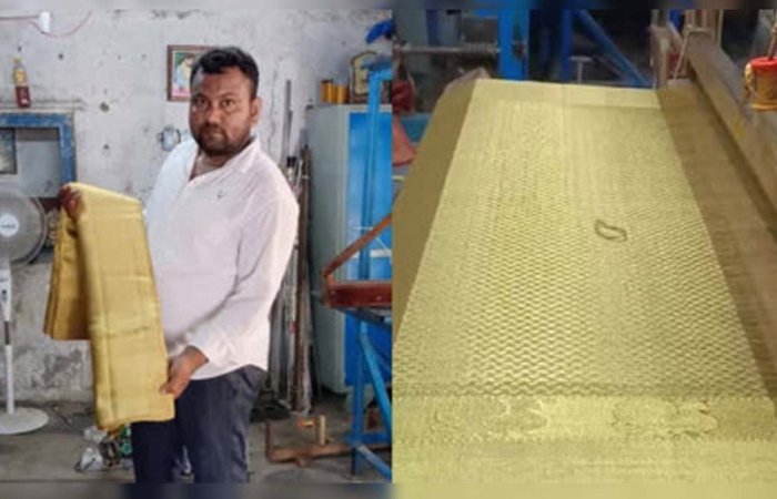 એક બિઝનેસમેને દીકરીના લગ્ન માટે સોનાની સાડી બનાવડાવી છે. તેલંગણના સિરસિલા શહેરના હાથ વણાટના કારીગર નલ્લા વિજયકુમારે આ સાડી બનાવીને સાડી બનાવવાનો સુવર્ણ ઇતિહાસ રચ્યો છે. 49 ઇંચ પહોળી અને સાડાપાંચ મીટર લાંબી સાડીમાં 200 ગ્રામ શુધ્ધ સોનુ વપરાયું છે.
