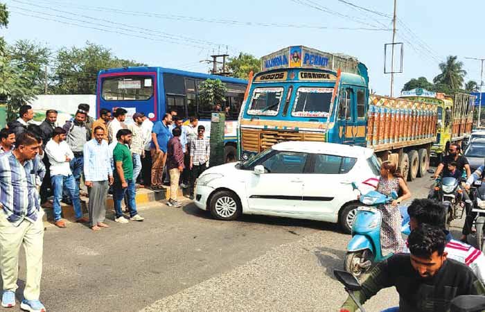 જૂનાગઢ શહેરના સતત ધમધમતા એવા ટીંબાવાડી રોડ પર દીપાંજલિ સોસાયટી પાસે એક બેફામ દોડતા ટ્રકે મારુતિ કારને ટક્કર મારતા અકસ્માત સર્જાયો હતો. સદનસીબે, આ ઘટનામાં કોઈ જાનહાનિ કે મોટી ઈજાના સમાચાર પ્રાપ્ત થયા નથી, પરંતુ અકસ્માતને પગલે રસ્તા પર લાંબો ટ્રાફિકજામ સર્જાતા વાહનચાલકો મુશ્ર્કેલીમાં મુકાયા હતા. સ્થાનિકોના જણાવ્યા અનુસાર, મેંદરડા અને સાસણ જવા માટે શહેરમાં હજુ સુધી કોઈ વૈકલ્પિક બાયપાસ રોડ બનાવવામાં આવ્યો નથી. આથી, ભારે લોડિંગ વાહનો અને ટ્રકો ટીંબાવાડી જેવા રહેણાંક અને વ્યસ્ત વિસ્તારમાંથી પસાર થાય છે, જે વારંવાર અકસ્માતનું કારણ બને છે. ટીંબાવાડી રોડ પર વધતા જતા ટ્રાફિક અને અકસ્માતોને રોકવા માટે હવે મેંદરડા સાસણ તરફનો બાયપાસ બનાવવો અનિવાર્ય બન્યો છે. વારંવાર રજૂઆતો છતાં આ પ્રશ્ર્ન વણઉકેલ્યો રહેતા સ્થાનિકોમાં પણ રોષ જોવા મળી રહ્યો છે.