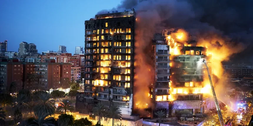 સ્પેનના વેલેન્સિયામાં એક 14 માળની ઈમારતમાં ભીષણ આગ લાગવાની ઘટના સામે આવી હતી. ઘટનામાં 4 લોકો મૃત્યુ પામી ગયા છે. જ્યારે 20થી વધુની હજુ સુધી કોઈ ભાળ મળી નથી. આ લોકો પણ મૃત્યુ પામી ગયાની આશંકા વ્યક્ત કરવામાં આવી રહી છે. આ ઘટના ગુરુવારે સાંજે 5:30 વાગ્યે બની હોવાનો દાવો કરવામાં આવી રહ્યો છે. ઘટના સમયે આગ લાગતાં લગભગ 350 લોકો તેમના ઘરોમાં જ ફસાઈ ગયા હતા. અનેક લોકોએ ડરને કારણે ઈમારત પરથી જ છલાંગ લગાવી દીધી હતી. જોકે તેમના માટે નીચે મેટ પાથરવામાં આવી હતી.